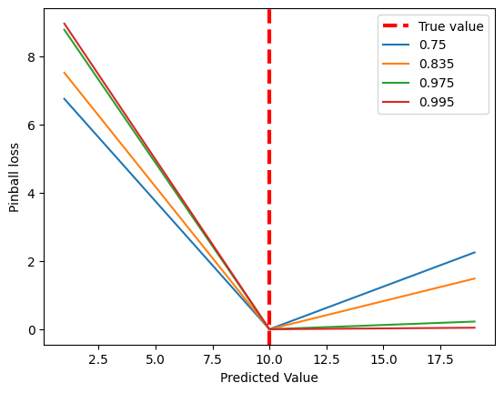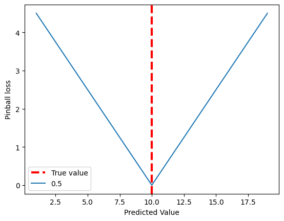 수식만으로는 Pinball Loss를 이용했을 때 모델이 어떤 방향으로 학습될지, 어떤 예측 결과가 나와야 Pinball Loss가 낮아지는지 알아보기 어려우니 분위수에 따른 Loss 값의 그래프를 확인해본다.