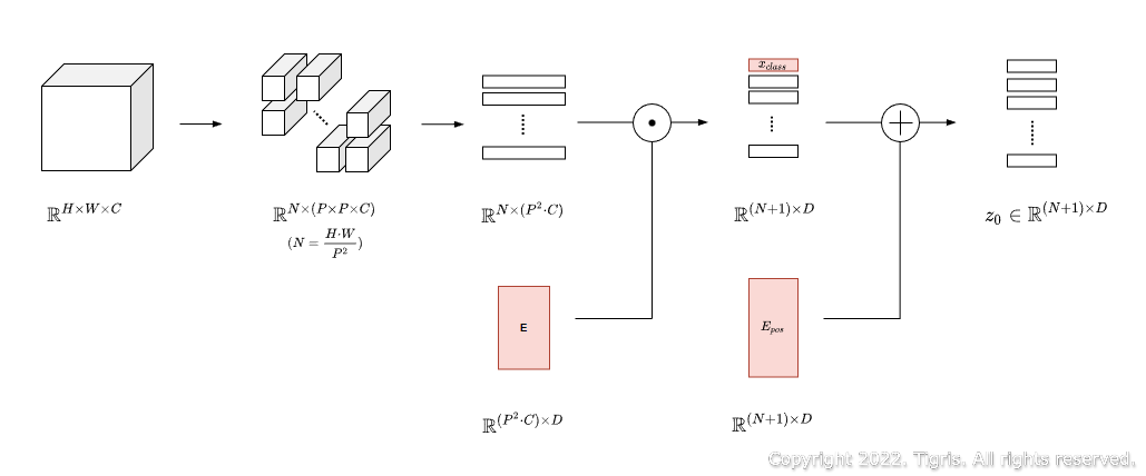 Embedding Matrix(E)를 이용하여 각각의 Patch를 D차원으로 Embedding 해줍니다.