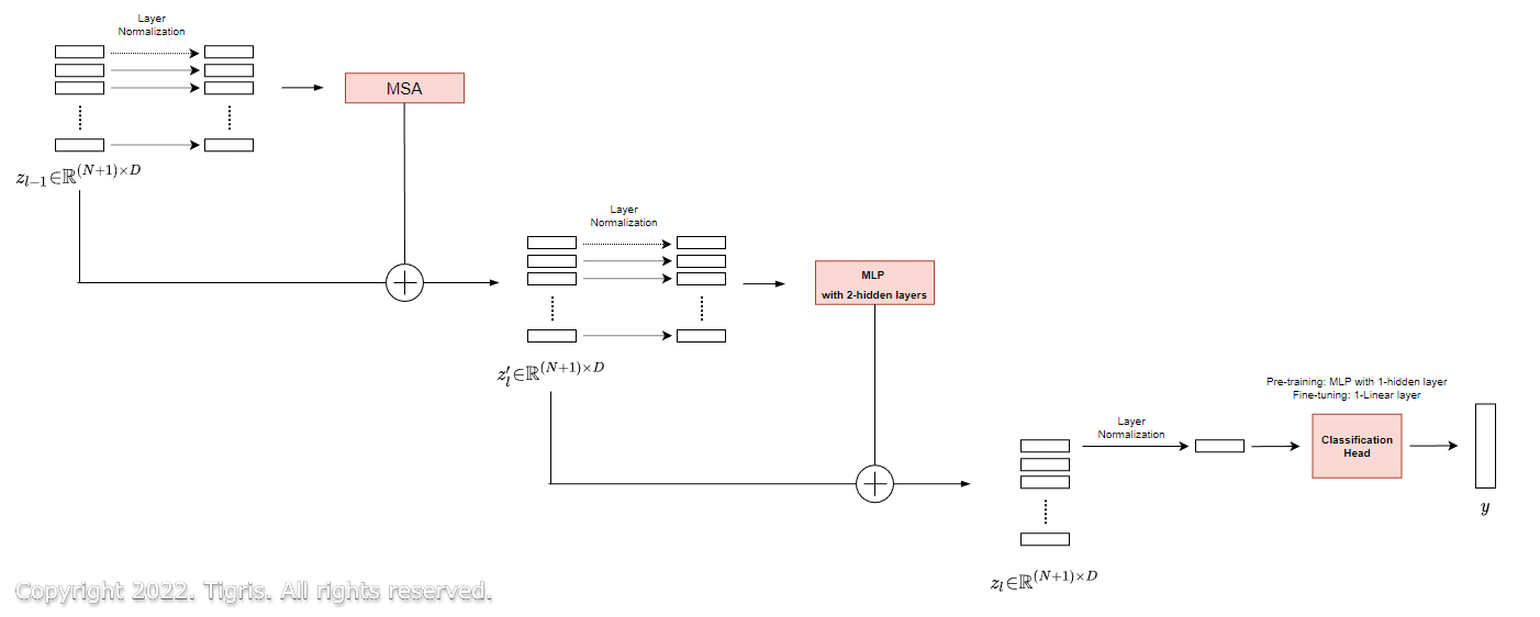 2. 원논문에서는 Multihead Self-Attention(이하 MSA)과 MLP 이후에 Layer Normalization(이하 LN)이 이루어졌다면, ViT에서는 LN 이후에 MSA, MLP가 위치합니다.